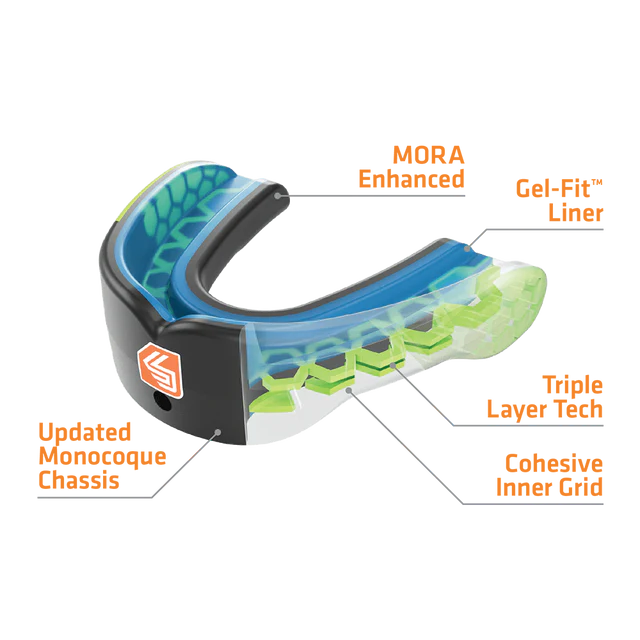 - BUILT TO PROTECT – Shock frame shields teeth and jaw from side impacts. Can provide full mouth protection during the hardest impacts. Protects your cheek and tongue, can help prevent teeth grinding, and secures teeth in place.